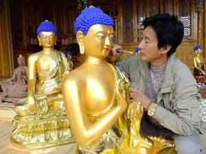 师承父亲,八岁时接触热贡艺术中的泥塑,后来练习泥塑、唐卡、堆绣技艺里最基本的底稿,并受老艺人指点。